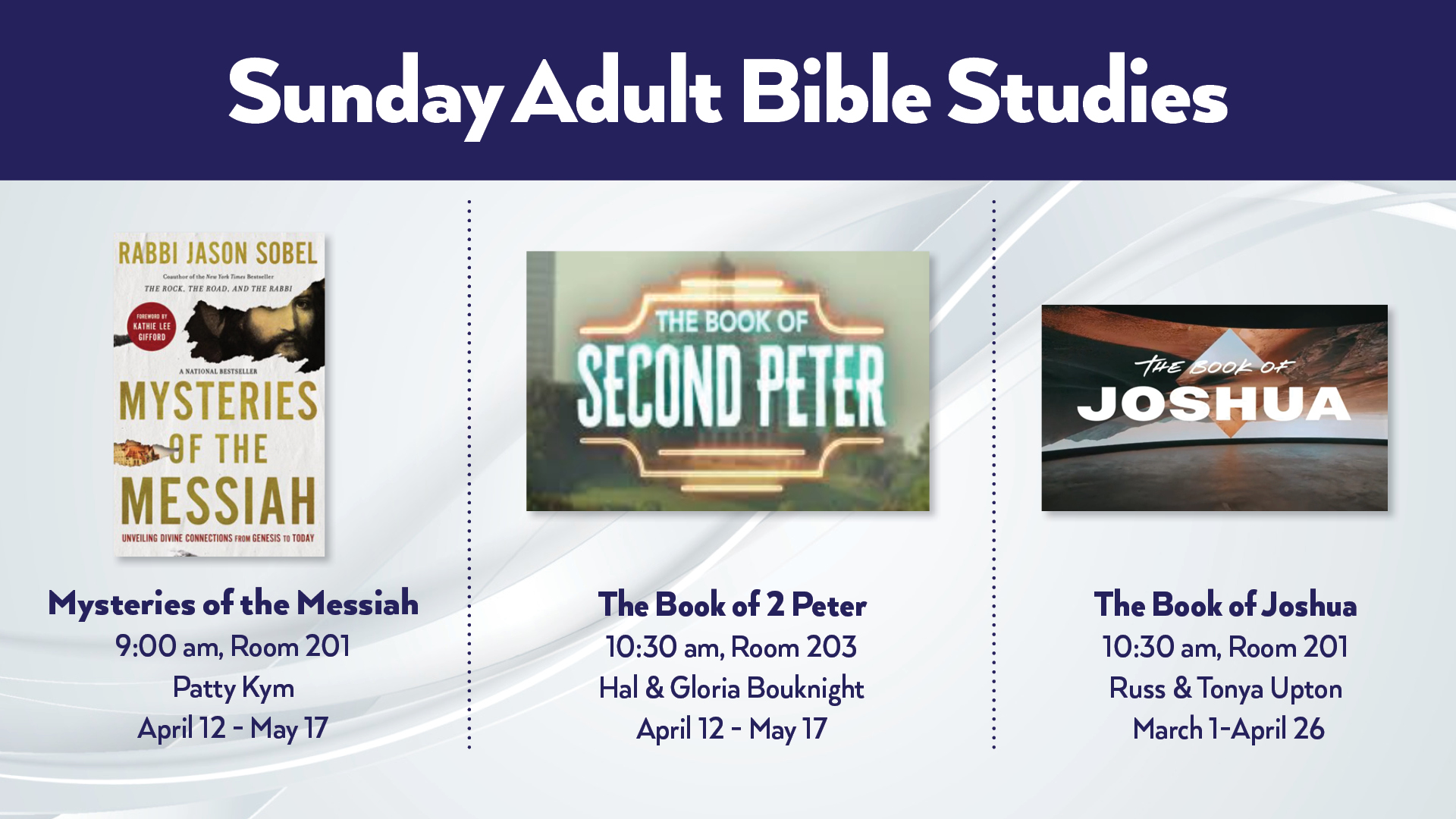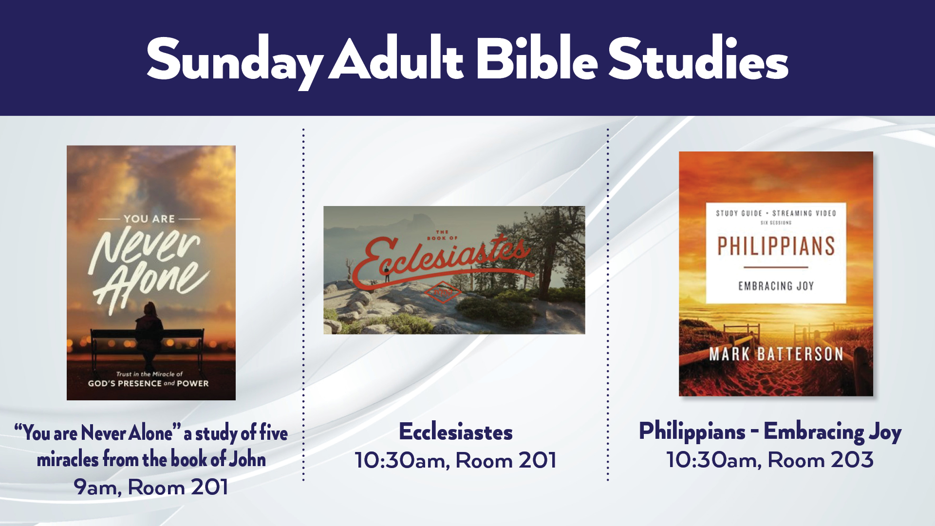 We have multiple Adult Bible Studies taking place on Sunday.